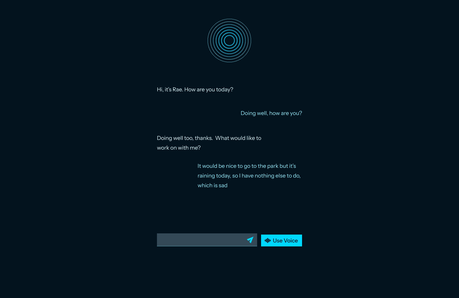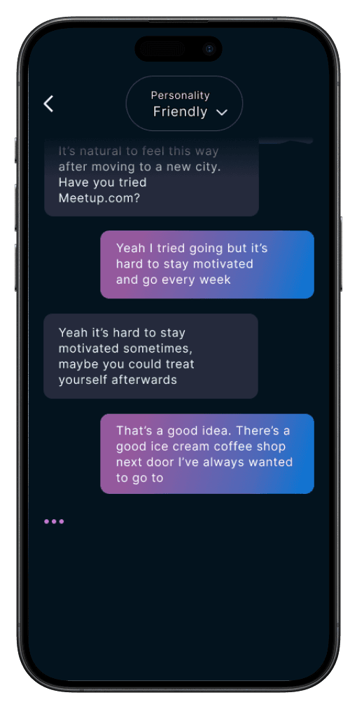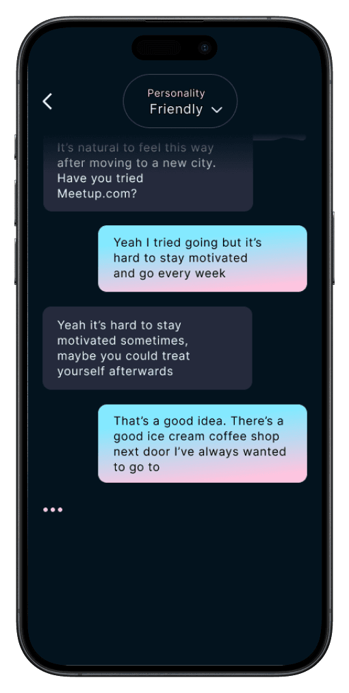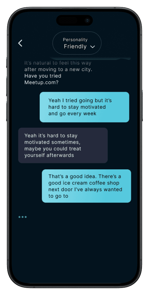 The overall feeling should be friendly, inviting and warm, so users enjoy talking to Rae. The experience should also feel calm, accepting and trustworthy, so users feel comfortable sharing personal emotions and experiences.