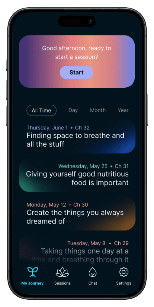 To build emotional connection and user stickiness, we wanted to visually show the user's mental health journey and the topics they talked about with Rae. There is also a clear CTA to do a session, where the banner changes colors depending on the time of the session.