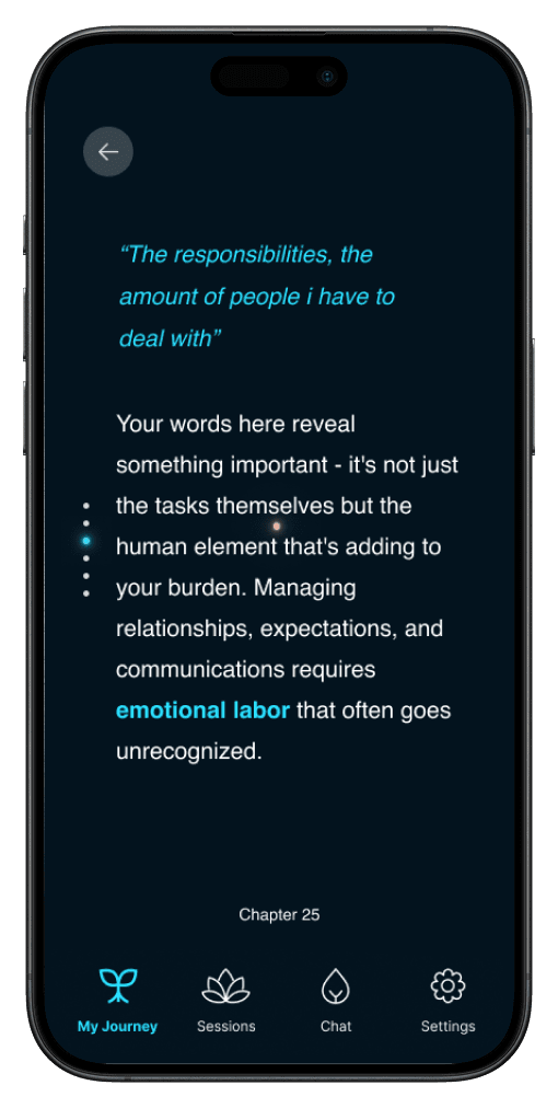 Another advantage of AI based therapy is the ability to generate insights and save them, instead of having to write them down and even forget important revelations. Many users also indicated they got a lot of value from reading insights at the end of each session. I redesigned the insights section to be more robust and organized with actionable next steps for users to take. To make it more personal, key quotes are highlighted. To mark progress, each session is a chapter, as in a chapter in their mental health journey.